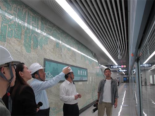 武汉地铁集团公司董事长周少东向市领导介绍7、8号线各个在建站点的艺术特色。周董介绍徐家棚站为手绘艺术表现形式,广大市民进入站点后可以感受到春秋季节的变换。